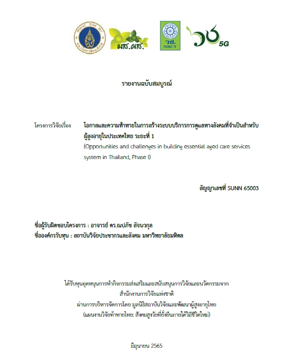 โอกาสและความท้าทายในการสร้างระบบบริการการดูแลทางสังคมที่จาเป็นสาหรับผู้สูงอายุในประเทศไทย ระยะที่ 1 Download Version Download 1 File Size 7.10 MB File Count 1 Create Date December 23, 2025 Last Updated December 23, 2025 โอกาสและความท้าทายในการสร้างระบบบริการการดูแลทางสังคมที่จาเป็นสาหรับผู้สูงอายุในประเทศไทย ระยะที่ 1